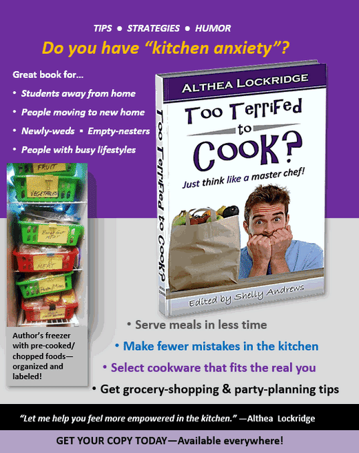 “If you feel inadequate or lost when it comes to mastering the art of food preparation, you are not alone. In Too Terrified to Cook? Just Think Life a Master Chef, you will find charts, exercises, and time/cost-saving strategies to help you feel more confident in the kitchen.” — Althea Lockridge, author